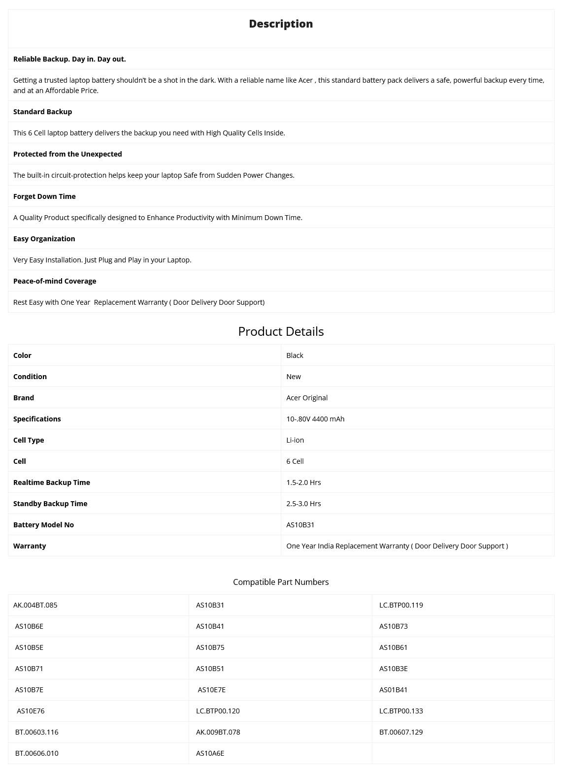 - Supplied Model no will be AS10B31. ACER Part no may be different.