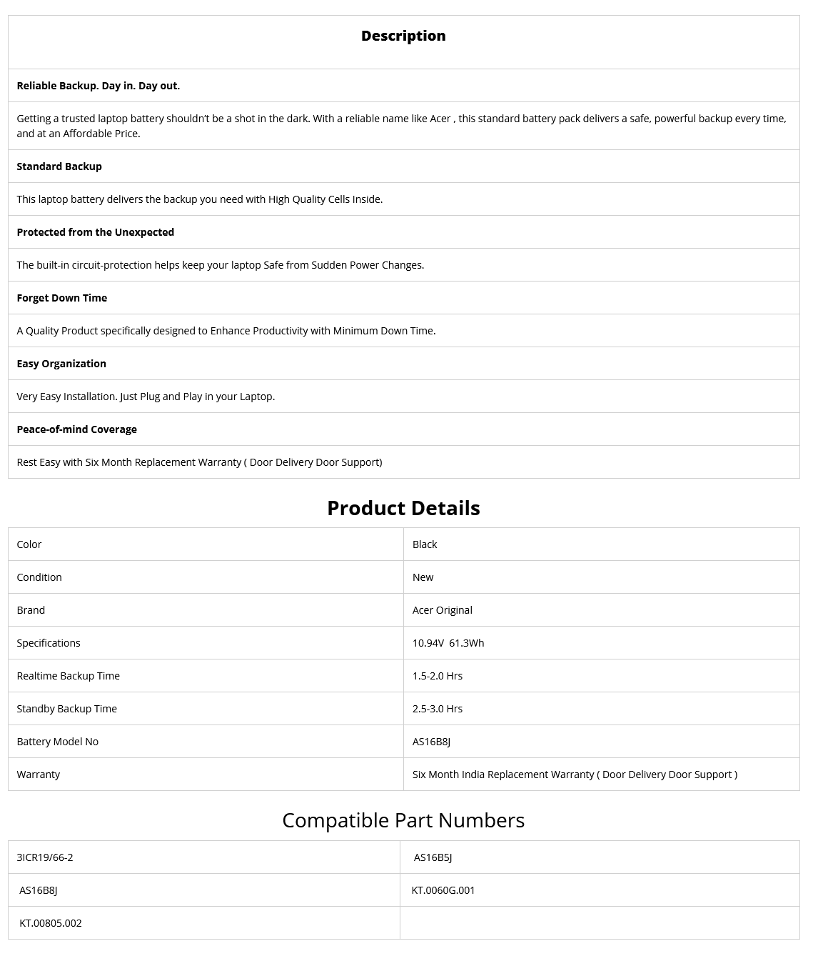• Supplied Model no will be AS16B8J. ACER Part no may be different.