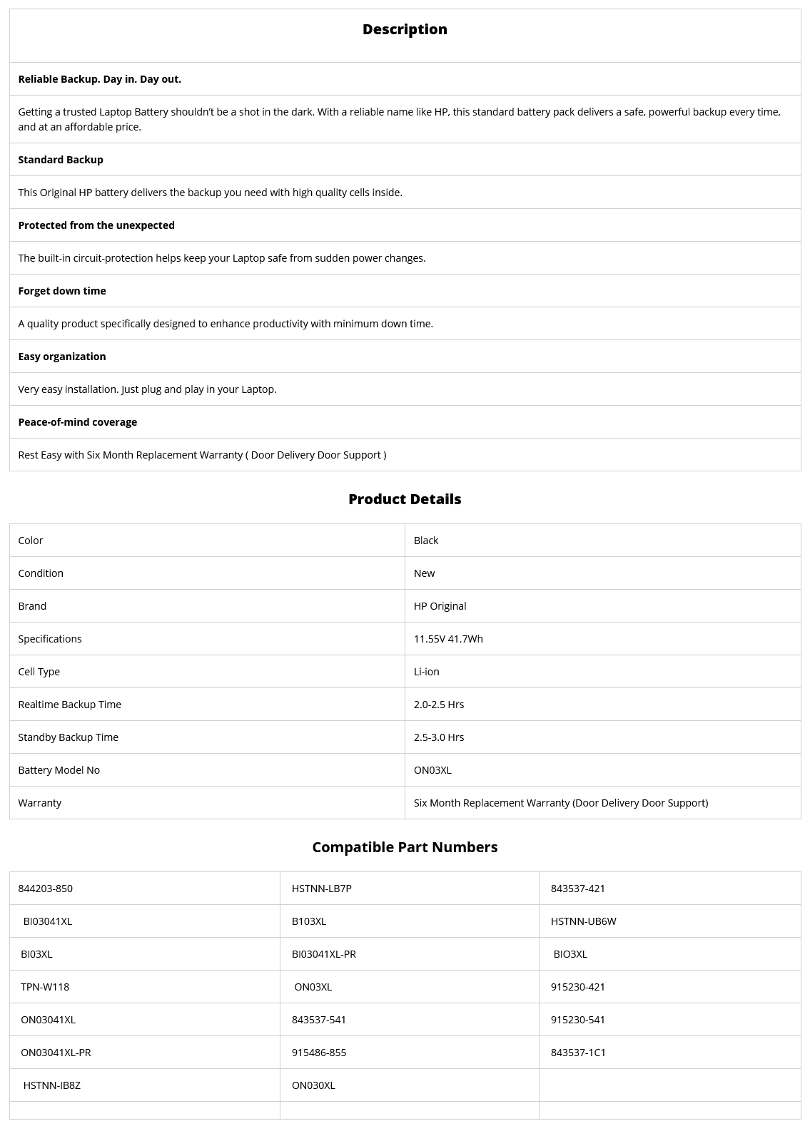 - Supplied Model no will be ON03XL. HP Part no may be Different.