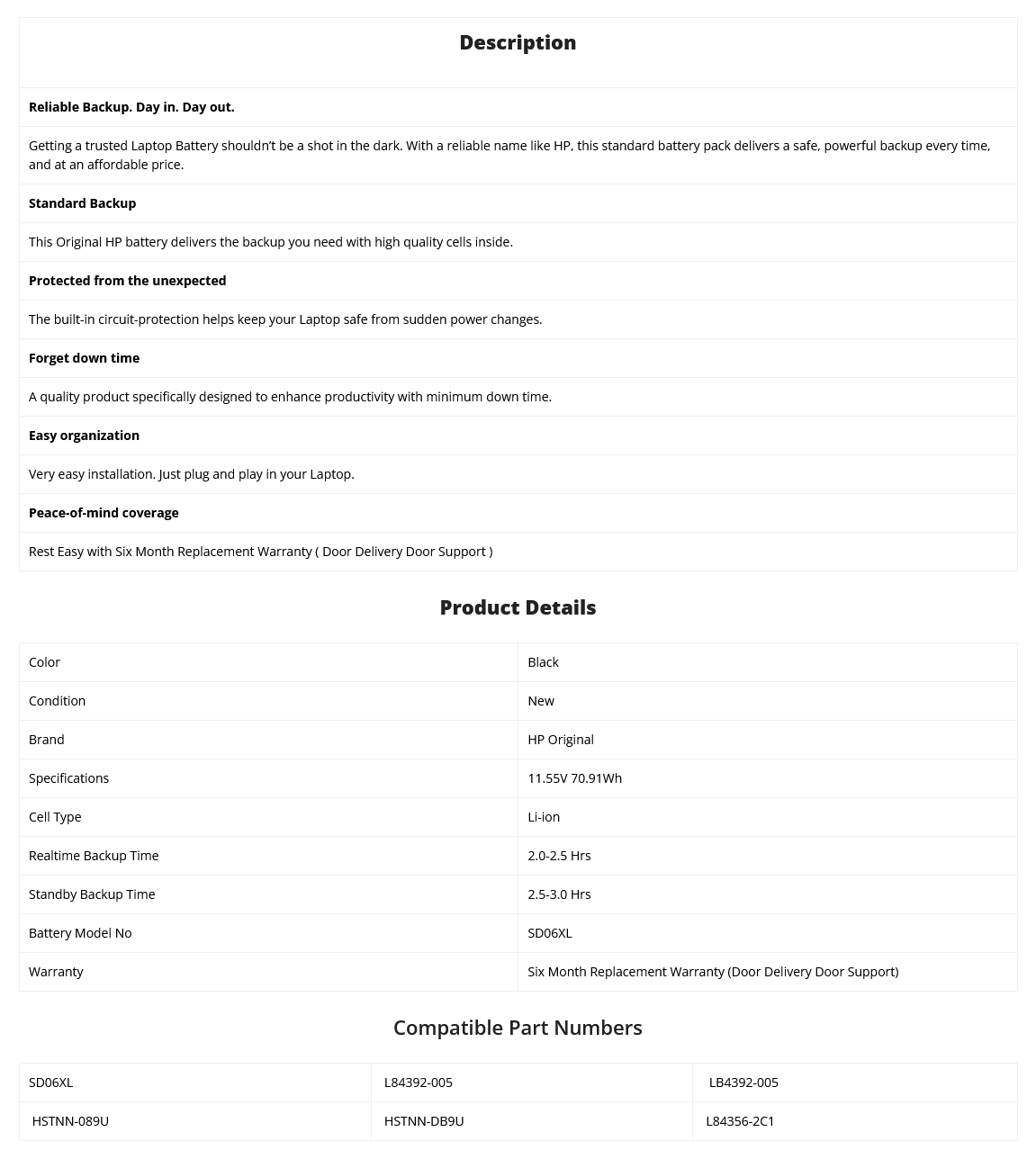 - Supplied Model no will be SD06XL. HP Part no may be Different.