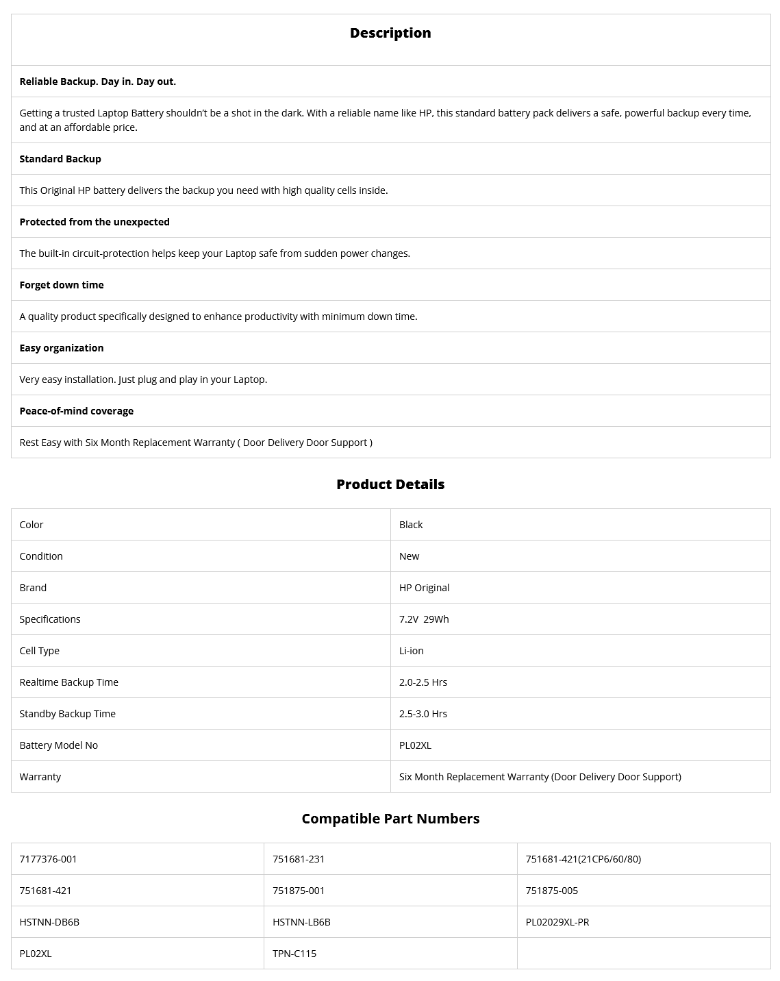 • Supplied Model no will be PL02XL. HP Part no may be Different.