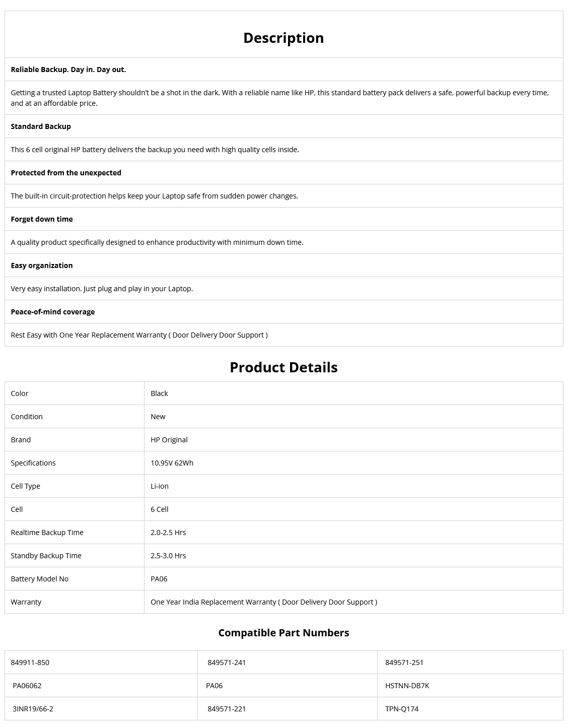 - Supplied Model no will be PA06. HP Part no may be Different.