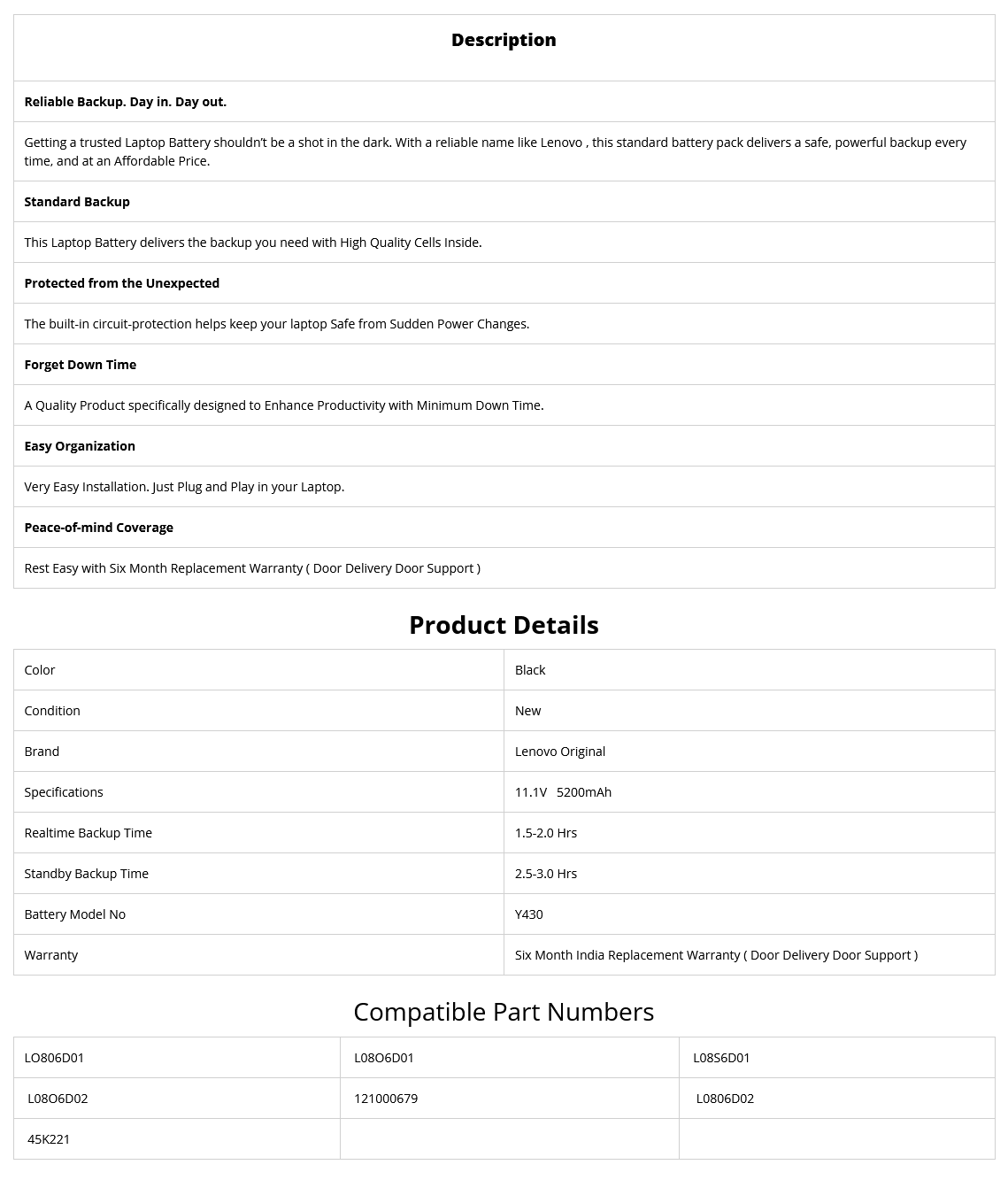 - Supplied Model no will be Lenovo Y430. Part no may be Different.