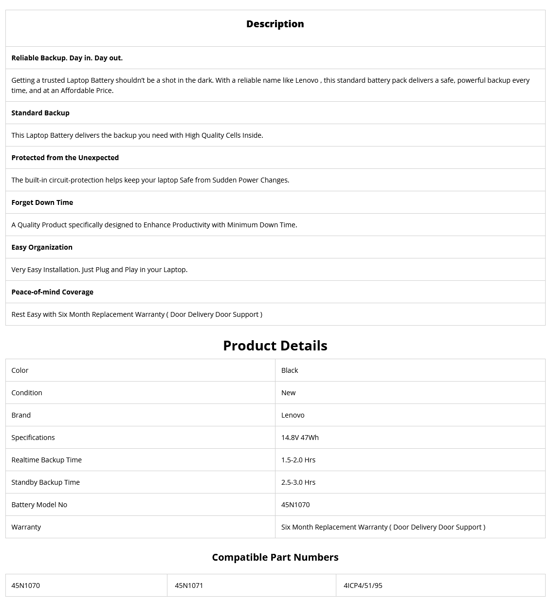 - Supplied Model no will be 45N1070. Lenovo Part no may be Different.