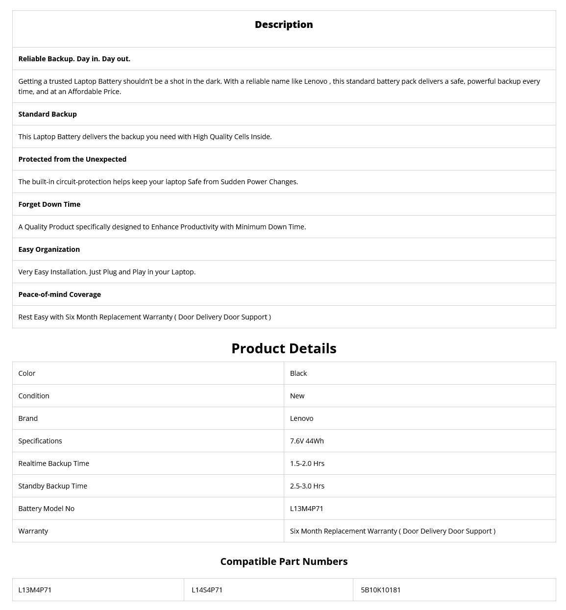 - Supplied Model no will be L13M4P71. LENOVO Part no may be Different.
