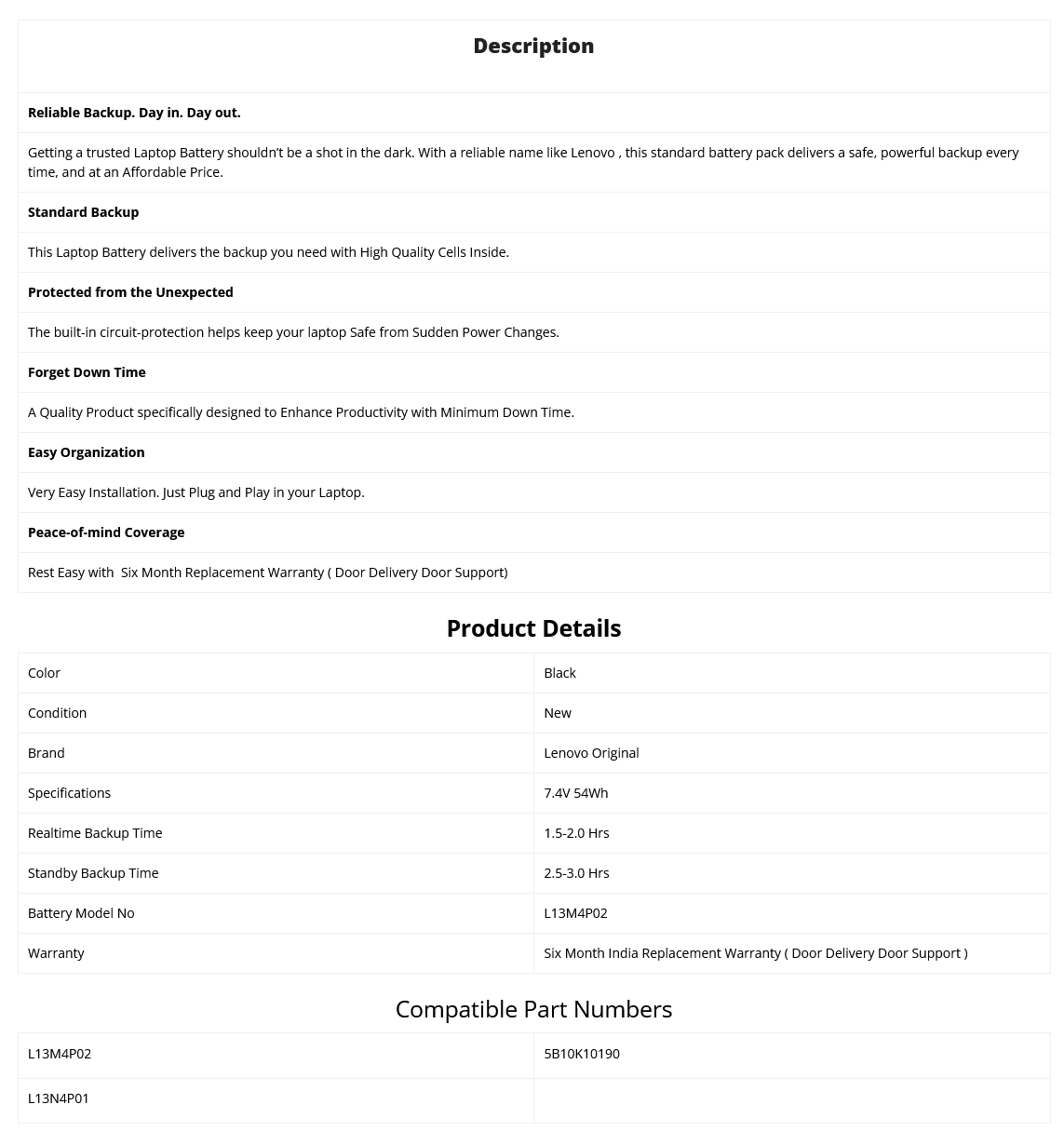 - Supplied Model no will be L13M4P02 Lenovo Part no may be Different.
